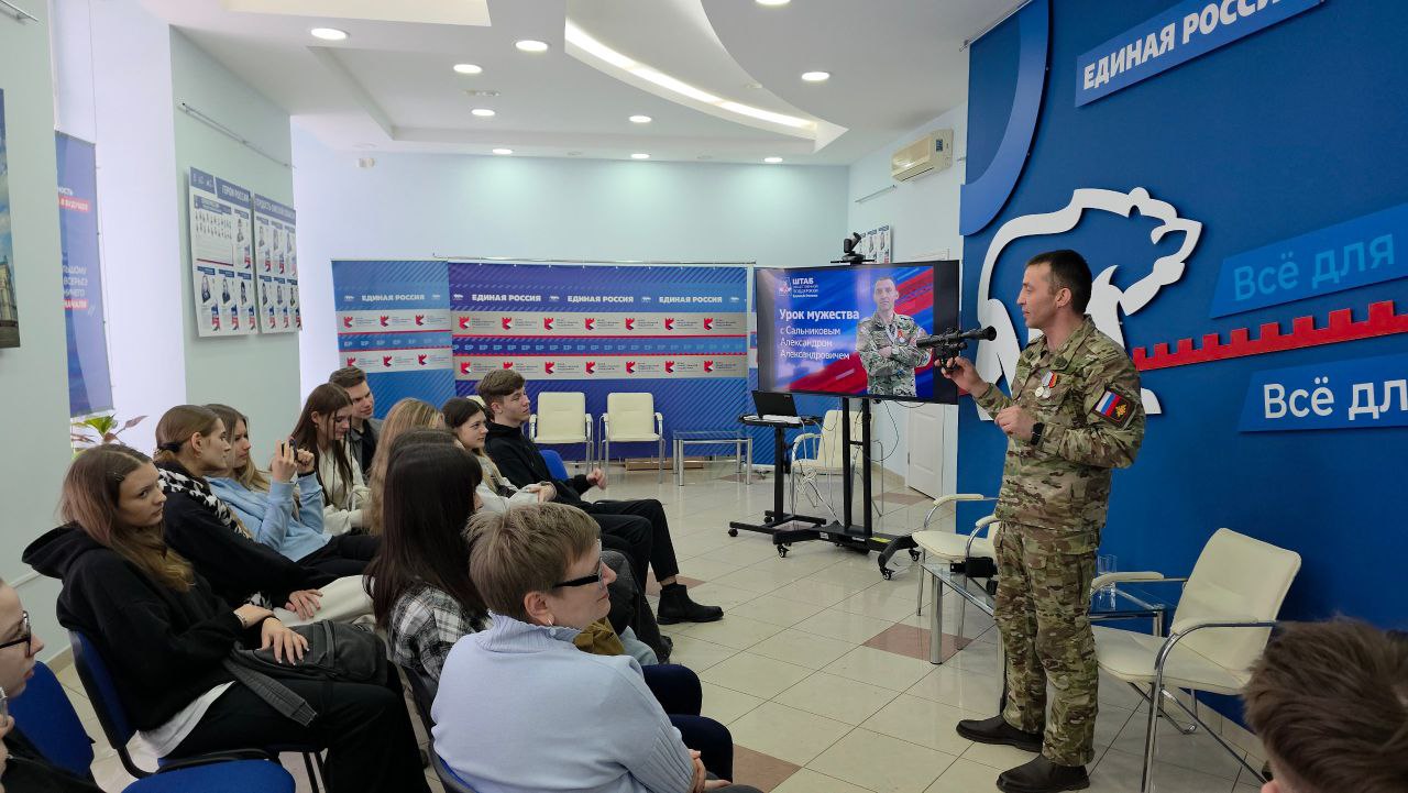 В Штабе общественной поддержки «Единой России» накануне Дня защитника Отечества прошел Урок мужества. Перед десятиклассниками школы № 37 встал ветеран СВО, кавалер медали Жукова и медали «За отвагу» Александр Сальников.